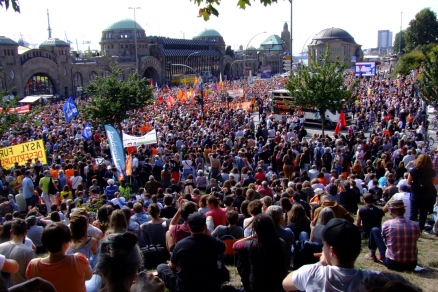 Ja, es war ein sehr breites Bündnis und ein noch breiteres Spektrum von Menschen, die da in Orange gegen Rechts und gegen das Sterben im Mittelmeer demonstriert haben. Die Kirchen waren dabei, Bischöfin Kirsten Fehrs hat eine (gute) Rede gehalten, selbst der schwerfällige DGB hat aufgerufen. Abgeordnete und Anhänger_innen der Grünen und der SPD haben teilgenommen, also der tragenden Parteien eines Senats, der gnadenlos abschieben lässt und bislang zu der politisch gewollten Tragödie im Mittelmeer schweigt.