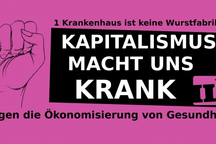 In der Krise der Gesundheitsversorgung zeigen sich die grundlegenden Widersprüche der spätkapitalistischen Gesellschaft klar und deutlich. Streiten wir für mehr als eine bessere Personalbemessung im Krankenhaus. Streiten wir für ein Herausbrechen der Gesundheitsversorgung aus dem kapitalistischen Markt und eine Zerschlagung der privaten Krankenhauskonzerne. Streiten wir für eine Vergesellschaftung der Krankenhäuser und eine grundlegende Demokratisierung von Gesundheit. Kommt zur Großdemonstration gegen Pflegenotstand am 22.09.2018. Los geht's um 12 Uhr, vor dem AK St. Georg.